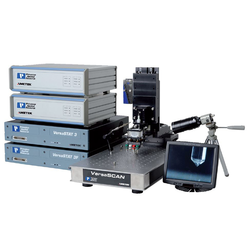 在線留言 聯(lián)系我們VersaScan微區(qū)掃描電化學(xué)工作站是一個建立在電化學(xué)掃描探針的設(shè)計基礎(chǔ)上的,進(jìn)行超高測量分辨率及空間分辨率的非接觸式微區(qū)形貌及電化學(xué)微區(qū)測試系統(tǒng)。它是提供給電化學(xué)及材料測試以極高空間分辨率的一個測試平臺。每個VersaSCAN都具有高分辨率,長工作距離的閉環(huán)定位系統(tǒng)并安裝于抗震光學(xué)平臺上。不同的輔助選件都安裝于定位系統(tǒng)上,輔助選件包括,如電位計,壓電振動單元,或者激光傳感器,為不同掃描探針試驗(yàn),定位系統(tǒng)提供不同的功能。VersaSTAT恒電位儀和Signal Recovery 7230鎖相放大器和定位系統(tǒng)整合在一起,由以太網(wǎng)來控制,保證小信號的精確測量。